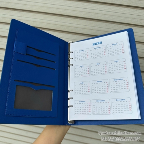 Mặt trong Sổ Tay có ngăn đựng name card và ngăn đựng bút, có tờ lịch đi kèm